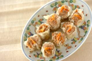 桜エビの赤色がきれい。鶏ひき肉を使ったヘルシーなシューマイ。