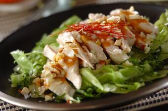 練りゴマとラー油、鶏を蒸したときの汁を使ってピリ辛ジューシィーなタレに。野菜に大葉を混ぜて香りのアクセントをつけます。 25分 477Kcal