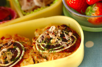 お好み焼きとご飯を一緒に食べたような一品。まわりのご飯がカリッと香ばしく焼けておいしいです。 15分 570Kcal