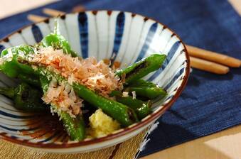 素麺つゆを含んだかつお節を甘長唐辛子にからめていただきます。時間がない時にもパパッと追加できる一品です。 5分 91Kcal