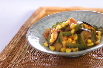 少し苦味のある沖縄のゴーヤ(ニガウリ)も夏に美味しい野菜。ナスとトウモロコシと一緒にみそとケチャップの風味でしゃっきり炒めましょう! 15分 238Kcal