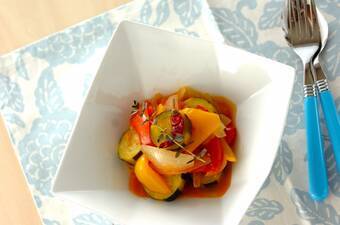 カレー粉がスパイシーに香る、さっぱり味の夏野菜のマリネです。 10分 81Kcal