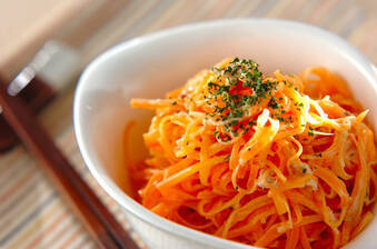 ニンジンの細切りをお子さんがする場合は、スライサーがあると便利ですね。ニンジンを電子レンジで加熱し、和えるだけのサラダです。 7分 182Kcal