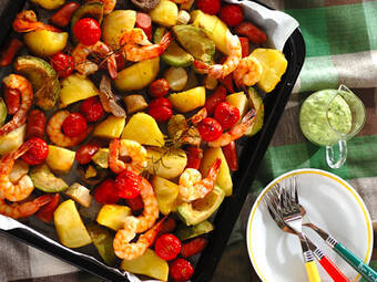 天板に材料をのせてオーブン焼くだけで出来る「ぎゅうぎゅう焼き」。焼いたアボカドもとろけておいしいですよ。 15分