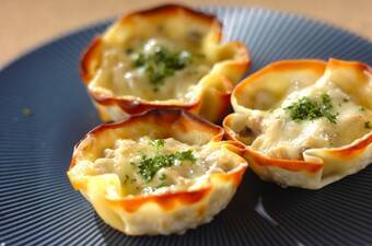 タラのグラタンに春巻きの皮を張り付けてオーブンで焼きました。パリパリの皮を崩しながら食べる、食感が面白い一品です。 30分 350Kcal