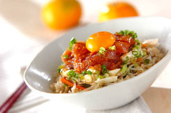 赤身マグロと卵黄には良質なタンパク質が、チリメンジャコにはカルシウム、ニンジンにはカロチン、小松菜とモヤシにはビタミンCがたっぷり! 20分 452Kcal