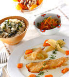白身魚・ホワイトソース。ホワイトソースを絡めて召し上がれ。 みかんパフェ。みかんがジューシーで美味しい、どこか懐かしいパフェ。