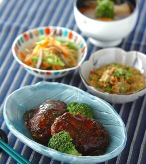 「肉汁ジューシー!ハンバーグの美味しい焼き方 赤ワインで蒸し焼き」の献立