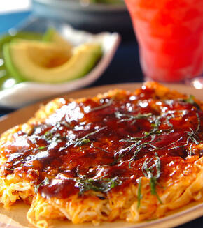 キムチとタコが入ったお好み焼きはボリューム満点。大葉の香りが上品。