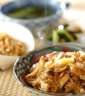 春雨を中華の味付けで煮込みます。ポイントはオイスターソースと干しシイタケ。旨みがアップします。ツナ炒り豆腐はご飯に合うので、ふりかけのようにして召し上がれ!