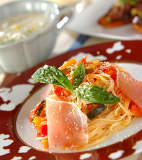 冷やした旬野菜の煮込みが生ハムの塩気と良く合います。ワインと一緒に召し上がれ!