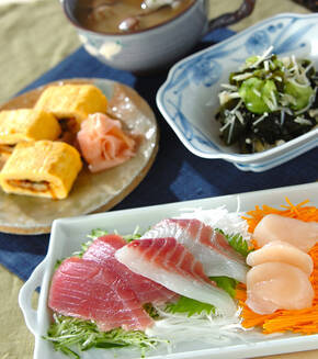 刺し身のケンは彩りよく盛り合わせましょう! う巻き卵はウナギ蒲焼きを贅沢に使った一品です。