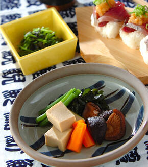 高野豆腐とシイタケを別々に煮る事でそれぞれの味が楽しめます。カツオのにぎり寿司はサッパリと大根おろしで。