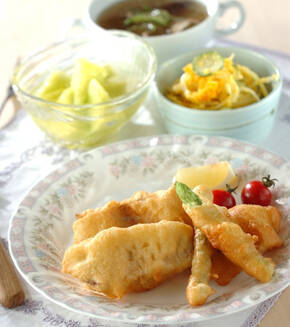 フリットがサクサクになるのは、衣にビールを加えるから! サラダはジャガイモとカボチャのダブル使い!