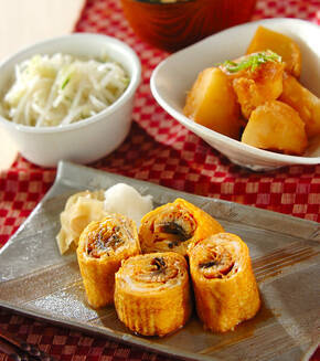 ウナギ蒲焼きが入った卵焼きは食べ応え十分でスタミナ満点なメインに! 今が旬の梨を入れたサラダはシャキシャキ歯ごたえが楽しい♪