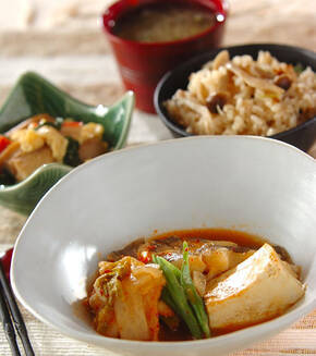 カレイをキムチと一緒に煮た一品に、香り高いシメジ炊き込みご飯を添えて。