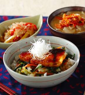 脂ののったブリをピリ辛のタレで丼ぶり仕立てに。キムチがのった変わり豚汁と組み合わせ、スタミナアップを図りましょう。