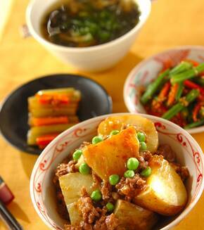 メインはしっかりとした味がおいしいピリ辛煮! スープは春雨入りのヘルシースープ!