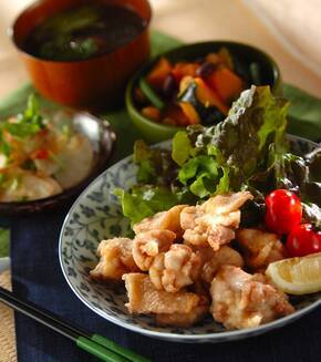 鶏の唐揚げに酢の物、煮物……基本を大切にした和献立です。