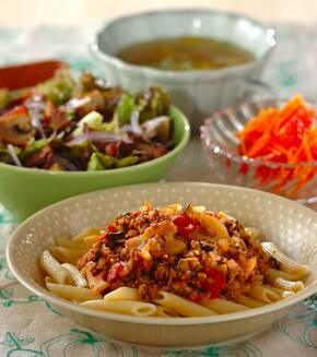 旬のキノコや根菜をたくさん使った献立です。コクのあるミートソースには、2種類のサラダを合わせて。