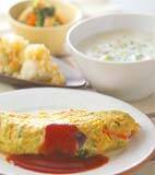 食卓の王様、すき焼き!甘辛の味付けがご飯に合う! タコのオムレツはタコとコーンの食感が楽しい。ワインソースで大人の味。