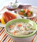 カキのシチューは牛乳をたっぷり使ってクリーミー!あったまりますね。 ゆで鶏はコクのあるピーナッツダレで!ゆで汁はスープに使えます。