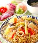 五目かた焼きそばは具だくさんで、食べごたえ満点! 皮から作るもっちり焼き餃子!もちもちの食感がたまらない!