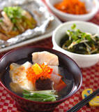 新年は京風白みそ雑煮で。甘めの白みそとカラシの相性ばっちり。 白粥・あんかけ。乾燥貝柱の旨味がたっぷりのあんを掛けていただきます。