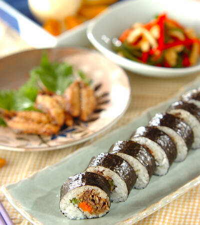 今週は節分。恵方巻きには甘辛い牛肉のしぐれ煮を巻いた巻き寿司で節分を楽しみましょう。