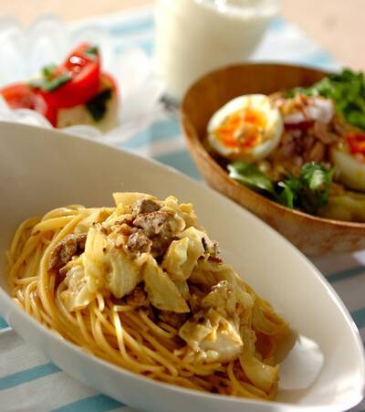 • 主食 ひき肉とキャベツのカレークリームスパゲティー