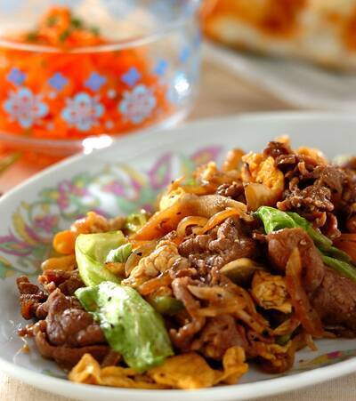 • 主菜 牛肉、卵、レタスの黒コショウ炒め