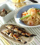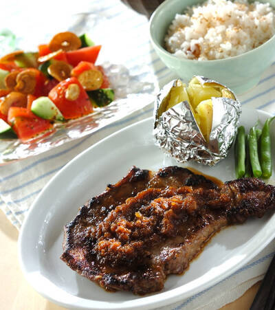 【メイン食材】白ウリ、トマト、アスパラなど。夏野菜がたっぷり! メインはステーキ、餃子やウナギなどスタミナ満点!