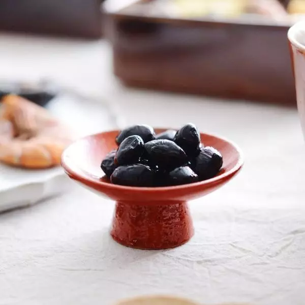 豆皿なのに高台。そのミニチュア感が愛らしく、それでいて刷毛目を施した赤絵から、しっかり作り込まれていることが伝わります。落ち着いた赤みは伝統的な日本の慶事の色。他のお正月の器たちの中にあっても見劣りすることがありません。