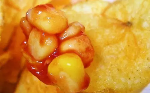 じゃが芋が原料のポテトチップスとケチャップの相性はもちろん抜群。コーンのぷちっとした食感と甘みがアクセントとなっている。