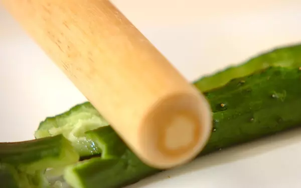 キュウリは両端を切り落とし、すりこ木で軽くたたき、食べやすい大きさに分ける。