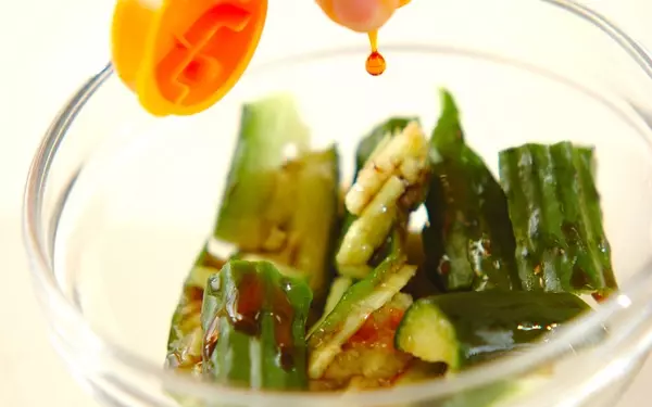1、キュウリにラー油としょうゆを加えて和え、器に盛る。