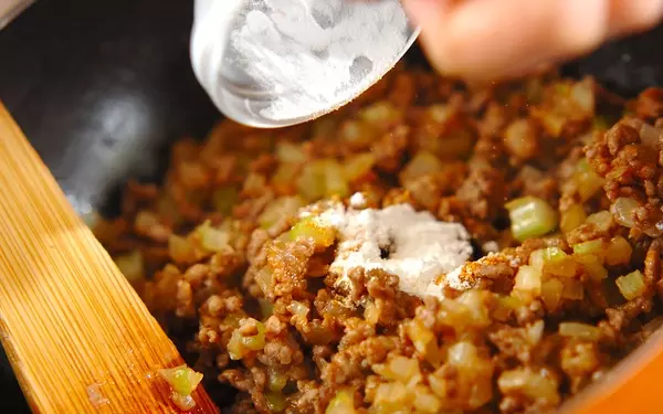 4、タコシーズニングスパイスとコーンスターチを混ぜ合わせ、(3)に振りかけるように加えて炒め合わせる。