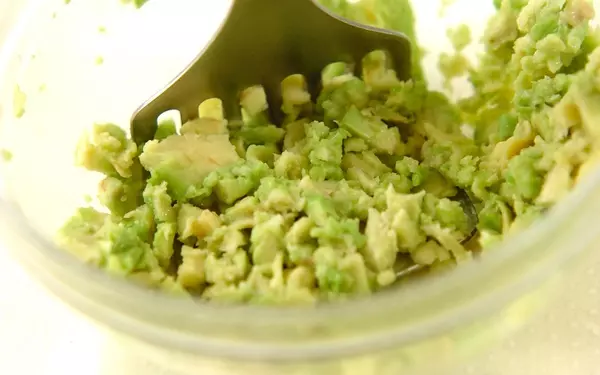 6、<アボカドのディップ>を作る。アボカドは縦にグルッと包丁を入れ、両手でねじるようにまわして半分に分け、包丁の角を種に刺して種を取る。果肉をスプーンですくい取って粗くつぶし、他の<アボカドのディップ>の材料を混ぜ合わせる。