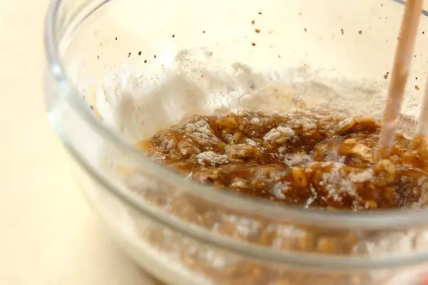 3、(1)、(2)に<衣>をつけ、フライパンに2~3cmのサラダ油を熱してカラッと揚げる。