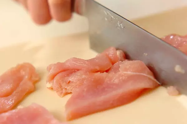 2、鶏むね肉は身の厚い部分に切り込みを入れて人数分に切り、塩コショウをしてさらに酒をもみ込む。