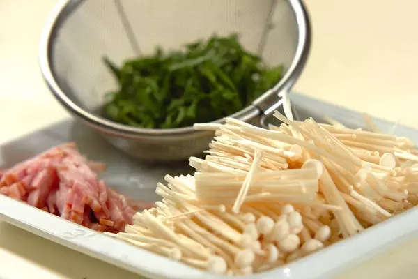 2、フライパンにオリーブ油少々を入れ、中火でベーコンがカリッとするまで炒め、エノキを加えて炒め合わせる。