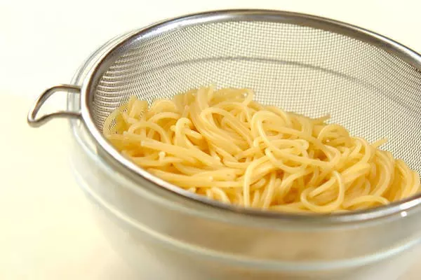 1、たっぷりの熱湯に塩を入れてスパゲティーを加え、少しかためにゆでてザルに上げる。