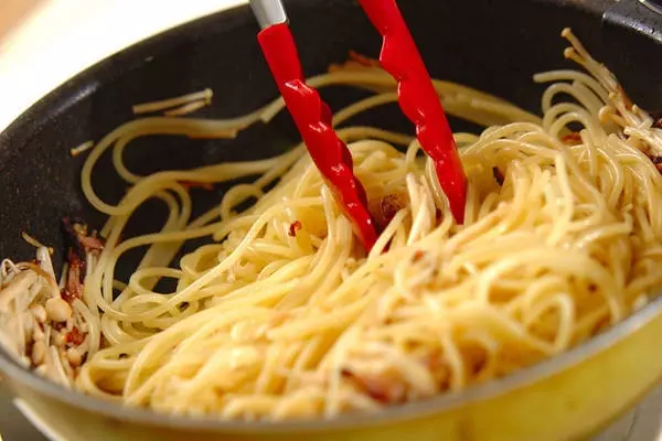 3、スパゲティーを熱いうちに(2)のフライパンに加える。残りのオリーブ油、バターを加えて余熱で溶かし、全体にからめる。