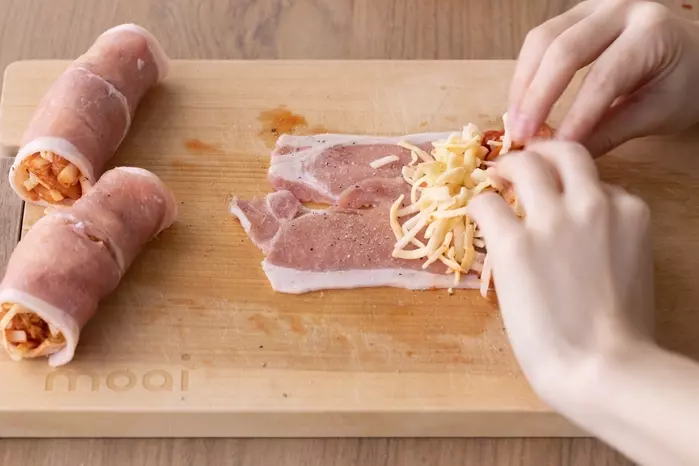 1、豚肉を2枚並べて塩胡椒する。肉の手前にキムチ、チーズをのせて巻く。片栗粉を全面に薄くまぶす。