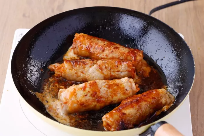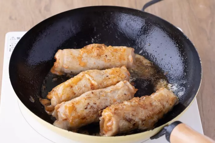 2、フライパンでサラダ油を中火で熱し、巻き終わりを下にして、全体に焼き色がつくまで焼く。