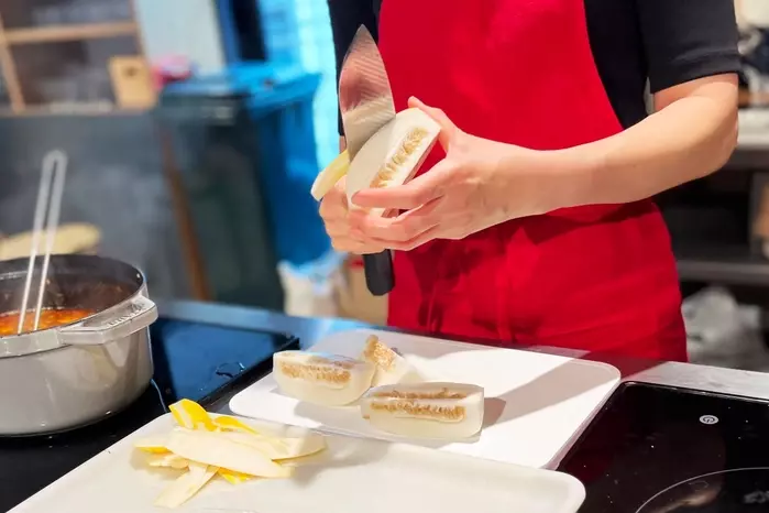 皮は固いのでむいてから使う。実の部分は柔らかいのでサクサク切れます。