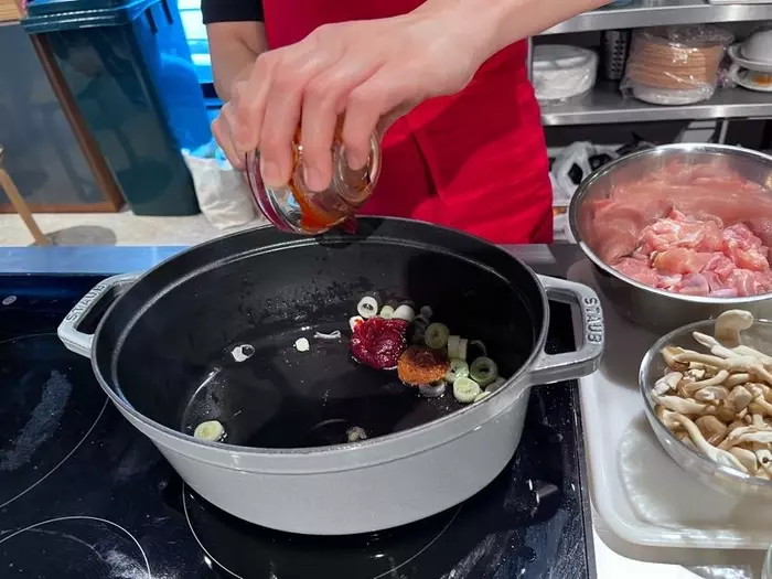 1、鍋にごま油、長ネギを入れ炒め香りが立ったらコチュジャンと味噌を入れ炒める。