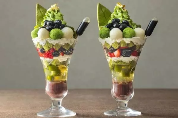 まず注目したいのは、上質な抹茶の風味が魅力の「抹茶パフェ」だ。あずきや白玉団子、ミルクアイス、ミックスベリーなどを重ね、バランスよく組み合わされた酸味や異なる食感を楽しめる。グラスには黒蜜ソースを添えており、パフェにかけることで味わいの変化をもたらすことができる。