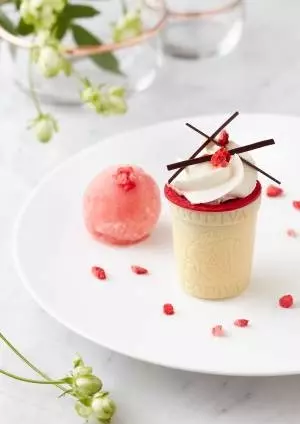 「クープショコラ チーズケーク オ フレーズ」は、ホワイトチョコレートのカップになめらかなベイクドチーズケーキを閉じ込めたスイーツ。まろやかな甘さに、甘酸っぱいストロベリーコンポートの爽やかな風味のアクセントをプラスして仕上げている。イートインでは、ストロベリーソルベを添えて提供される。