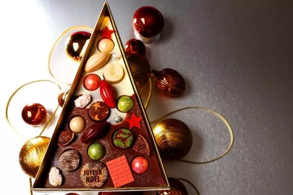 また、パレ ド オールの定番「クリスマス(X’mas)ツリーショコラ」が2020年も登場する。チョコレートで作られた土台の上には、ココナッツ味のクリームガナッシュや、いちごミルクガナッシュ、ビターガナッシュなど、10種類のガナッシュを包んだショコラが並ぶ。食感や味わいの異なるショコラを一度に楽しむことができる一品だ。